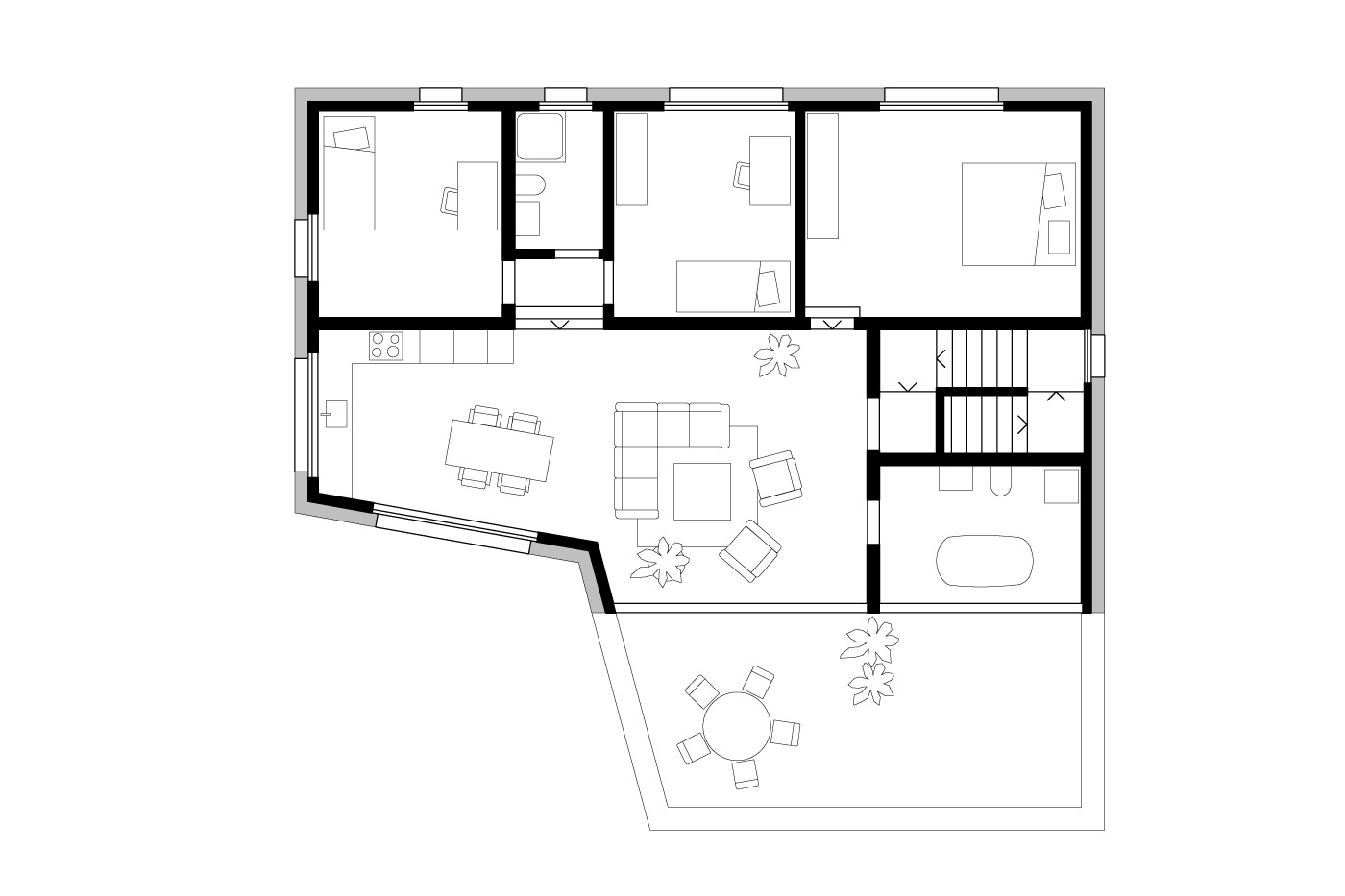 Zwei Wohnhaeuser mit insgesamt 5 Wohnungen sollen in einem dörflichen EFH-Wohnquartier intergriert werden ohne dabei den Massstab der Umgebung zu sprengen.