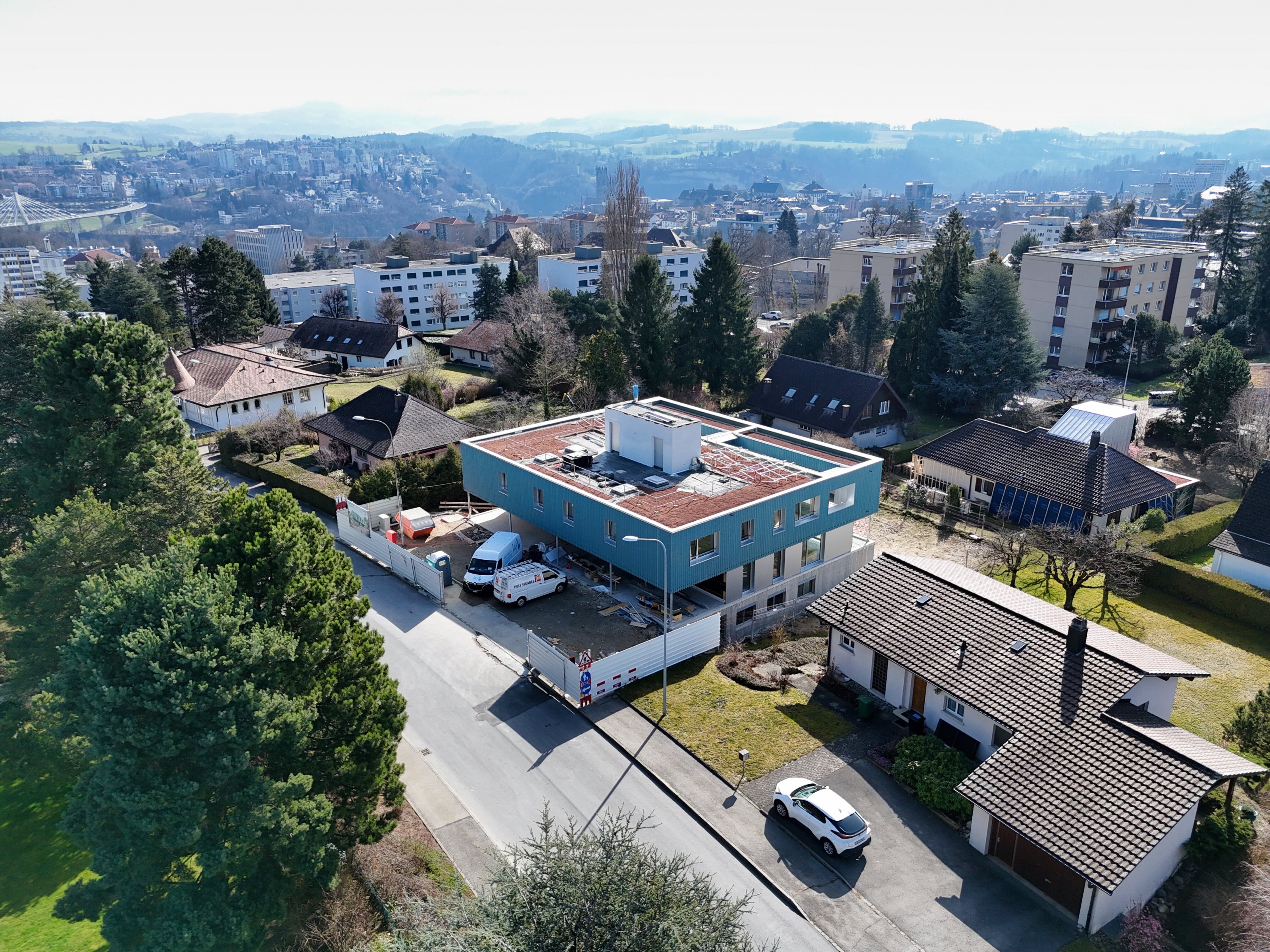 Die Stadt Freiburg plant eine massgebende Verdichtung mithilfe des neuen PAL, das derzeit überarbeitet wird. Das Jura-Viertel wird sich in den nächsten Jahren verändern, indem die Höhe der Gebäude abnimmt, je höher man auf den Torry-Hügel steigt. Das Projekt für neue Wohnungen fügt sich in diese Strategie ein, da es eine Verdichtung anstrebt und gleichzeitig eine Beziehung zu den Nachbargebäuden schafft und den Massstab des Viertels aufrechterhält.